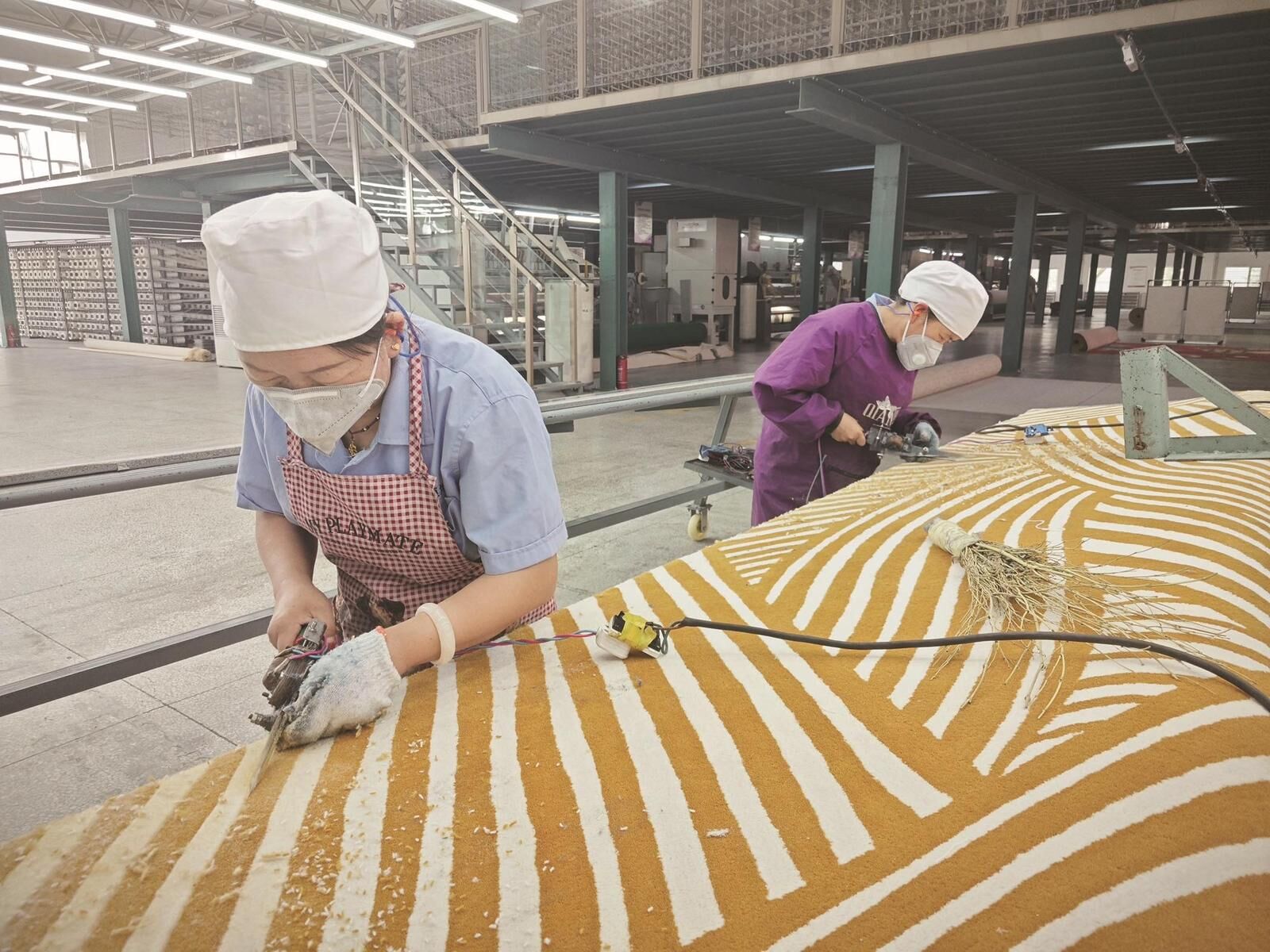 手工槍刺后整作業(yè)區(qū),十幾名經(jīng)驗(yàn)豐富的工作人員正埋首工作,手中的工具在毯面上靈活翻飛。從平毯、檢驗(yàn)到折邊、精修,每道工序都井然有序。另外一邊,2022年引進(jìn)的智能紗架系統(tǒng)正高效運(yùn)轉(zhuǎn)。