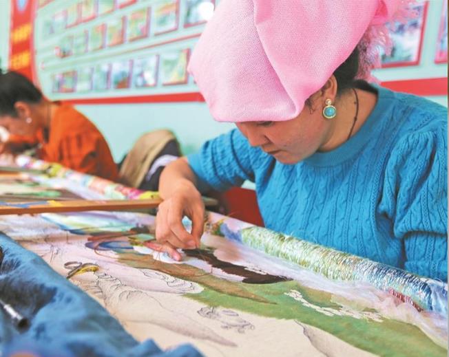 工作間里,村子里的繡娘們正巧手翻飛,埋頭縫制長卷,五彩絲線落點成線、連線成圖……61歲的仁青加不時地指導(dǎo)著大家。