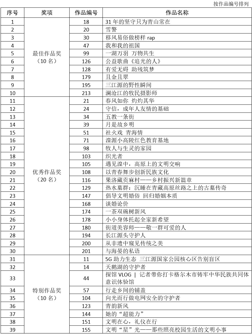 綜合網(wǎng)絡(luò)投票和專家評(píng)審,評(píng)選出最佳作品獎(jiǎng)10件、優(yōu)秀作品獎(jiǎng)20件、特別作品獎(jiǎng)10件。現(xiàn)將評(píng)選結(jié)果在青海新聞網(wǎng)和“江源新聞”客戶端進(jìn)行公示,公示期為2025年11月10日至2025年11月14日。公示期間,單位和個(gè)人均可通過(guò)來(lái)電、來(lái)信等形式,對(duì)擬獲獎(jiǎng)作品進(jìn)行實(shí)事求是、客觀公正地反映,并提供事實(shí)依據(jù)。