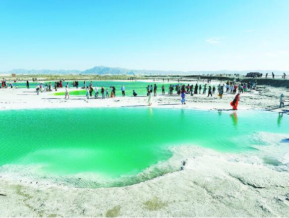 7月23日,記者在海西蒙古族藏族自治州大柴旦翡翠湖看到,一輛輛滿載著游客的大巴和來自全國各地的自駕車輛不斷駛?cè)刖皡^(qū)停車場。在位于大柴旦行委的翡翠步行街上,也涌滿了就餐的游客。據(jù)了解,最近正值暑期旅游旺季,每天進(jìn)入大柴旦翡翠湖的游客都在2萬人以上。攝影:潘玲