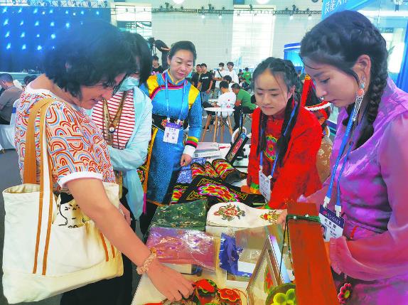同時(shí),旁邊展臺(tái)上一個(gè)個(gè)以土族盤繡為主的青繡作品,也以其精美圖案和精致做工吸引了眾多嘉賓駐足觀賞,有的還詢問起了價(jià)格。