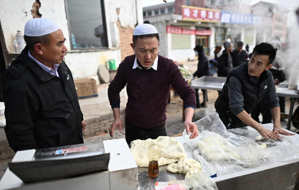 12月20日,在青海省民和縣官亭鎮(zhèn),居住在附近的馬國龍(右二)在拉面攤上幫忙拉面。新華社記者 張宏祥 攝