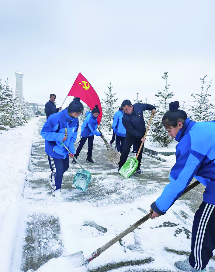 果洛州職業(yè)技術(shù)學(xué)校的師生在瑪沁縣烈士陵園內(nèi)除雪。果洛州職業(yè)技術(shù)學(xué)校供圖