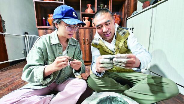 記者在東周(右)的指導下體驗藏紅陶制作。攝影:楊紅霞
