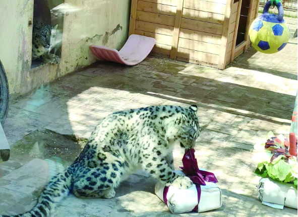 王亞萍負責雪豹“水墨”“油畫”和“傲雪”的飼養(yǎng)工作,言語和眼神中藏不住的寵溺:“它們可是親閨女,就得寵著。”