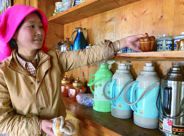 隨便走進一戶人家,濃濃的人間煙火氣息撲面而來。老人身披薄毯,愜意地坐在庭院里曬著太陽,眼里滿是安詳與滿足;家里的婦女看著鍋里“咕嘟咕嘟”沸騰的羊肉湯,手中的針線也一刻不停地在藏族服飾間來回穿梭;孩子們嬉笑奔跑,三五成群地做著游戲,他們的笑聲回蕩在整個社區(qū),與紅旗飄揚的聲音交織在一起,譜寫出一曲東格爾社區(qū)獨有的幸福樂章。