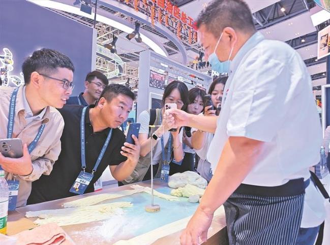 最熱鬧的當(dāng)數(shù)拉面技藝展示。全國(guó)勞動(dòng)模范、青海拉面匠人韓玉龍的案板前已圍得水泄不通。只見(jiàn)他抓起面團(tuán),在手中飛速揉搓、拉抻,面條從粗變細(xì),最后竟細(xì)如發(fā)絲。當(dāng)他拿起一根針,將十余根面條順利穿入針孔時(shí),人群中瞬間爆發(fā)出雷鳴般的掌聲。“太神奇了!”一位學(xué)生舉著手機(jī)錄完視頻,興奮地說(shuō),“一定要去青海吃正宗的牛肉拉面!”韓玉龍擦了擦手,遞上這次帶來(lái)的牛肉面產(chǎn)品,笑著說(shuō):“現(xiàn)在我們已經(jīng)研發(fā)了新產(chǎn)品,如果大家想品嘗現(xiàn)做的手藝,可以到線下店里——畢竟我們青海的拉面已經(jīng)開(kāi)遍全國(guó),還走進(jìn)了二十多個(gè)國(guó)家。”