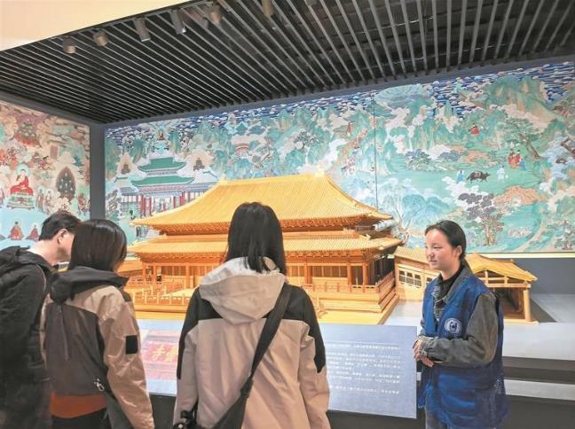 為了更好地完成自己的目標(biāo),在拿到講解詞后,范芠鑫迫不及待地練習(xí)起來(lái)。擔(dān)任暑期講解員后,她又針對(duì)游客感興趣的內(nèi)容不斷豐富自己的解說(shuō)。比如在講到舞蹈紋彩陶盆時(shí),她會(huì)補(bǔ)充介紹這件文物的原件藏于國(guó)家博物館;在介紹永樂(lè)款銅鎏金觀音立像時(shí),她會(huì)指著展廳一旁瞿曇寺隆國(guó)殿等比例微縮的木質(zhì)模型介紹瞿曇寺……
