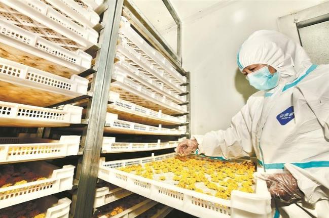 金秋十月,西寧市湟中區(qū)共和鎮(zhèn)蘇爾吉村的茶用菊田里菊花競(jìng)相綻放,宛如金色海洋。采摘工人穿梭在菊花種植基地,指尖輕捻,將朵朵飽滿的菊花收入竹籃;包裝車間里,空氣中陣陣清香沁人心脾,讓人沉醉,工人們手法嫻熟地將烘干后的菊花分揀、裝盒。