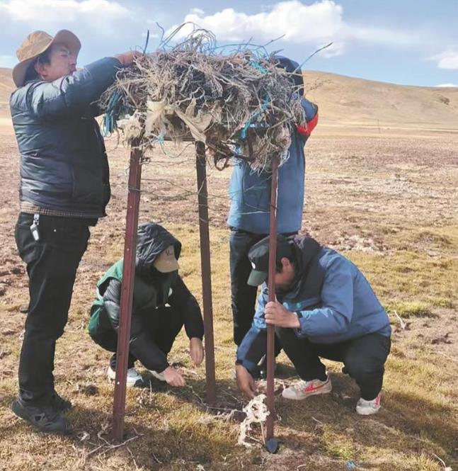 扎西(右一)和隊(duì)友搭建鳥窩。受訪者提供