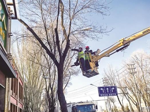 當(dāng)公交車駕駛員小心翼翼地避讓行道樹時,濱河南路上,登高作業(yè)車將兩名工作人員送至半空。工作人員一手抓著枝干,一手握著油鋸,隨著油鋸轟鳴聲響起,那些既影響通行安全又有礙道路美觀的枝條應(yīng)聲而落。地面上的工作人員隨即上前,迅速將鋸下的枝條搬到路邊的清運(yùn)車上,防止對過往車輛和行人造成干擾。