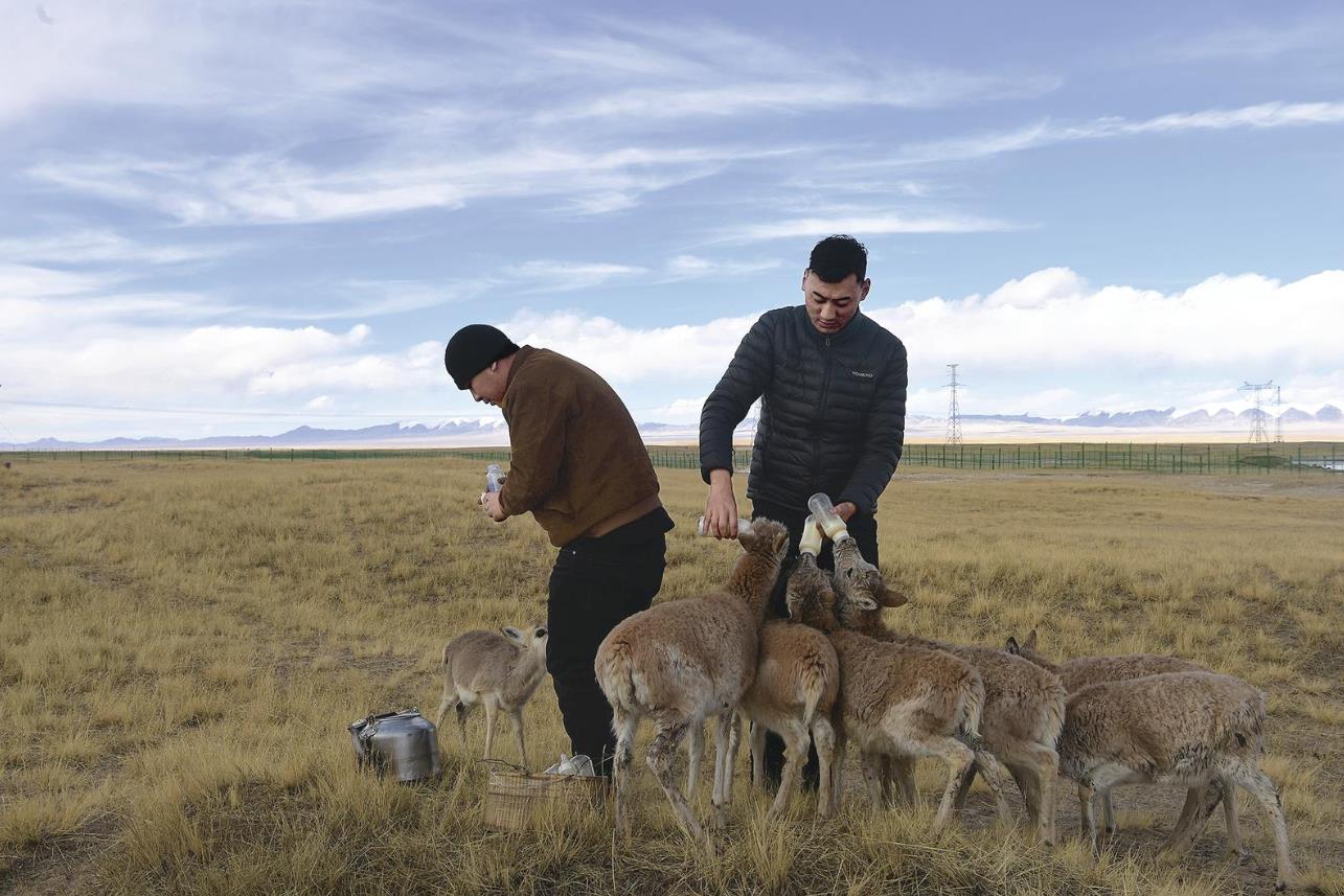 索南達(dá)杰保護(hù)站工作人員喂養(yǎng)救助的小藏羚羊。張多鈞 攝