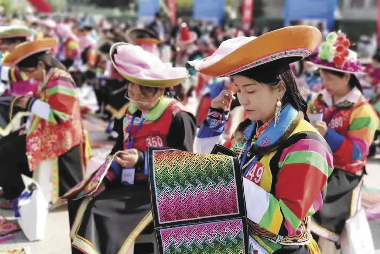 繡娘們?cè)谡故?ldquo;青繡”技藝。省文化和旅游廳供圖