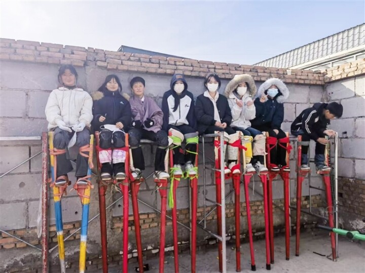 從生疏踉蹌到穩(wěn)健颯爽,姑娘們的付出藏在每一次練習(xí)里。課后、周末,村里的文化廣場上總能看到她們的身影:綁上高蹺站穩(wěn)、邁步、轉(zhuǎn)身,摔倒了就爬起來,膝蓋摔青了、腳踝磨破了,抹點(diǎn)藥繼續(xù)練。“剛開始踩上高蹺,感覺像踩在云朵上,連走路都打晃,現(xiàn)在能跟著節(jié)奏做動(dòng)作、走隊(duì)形,真的超有成就感!”馬守燕飾演的代戰(zhàn)公主,一個(gè)利落的轉(zhuǎn)身就能贏得滿堂彩,這份底氣全是練出來的。