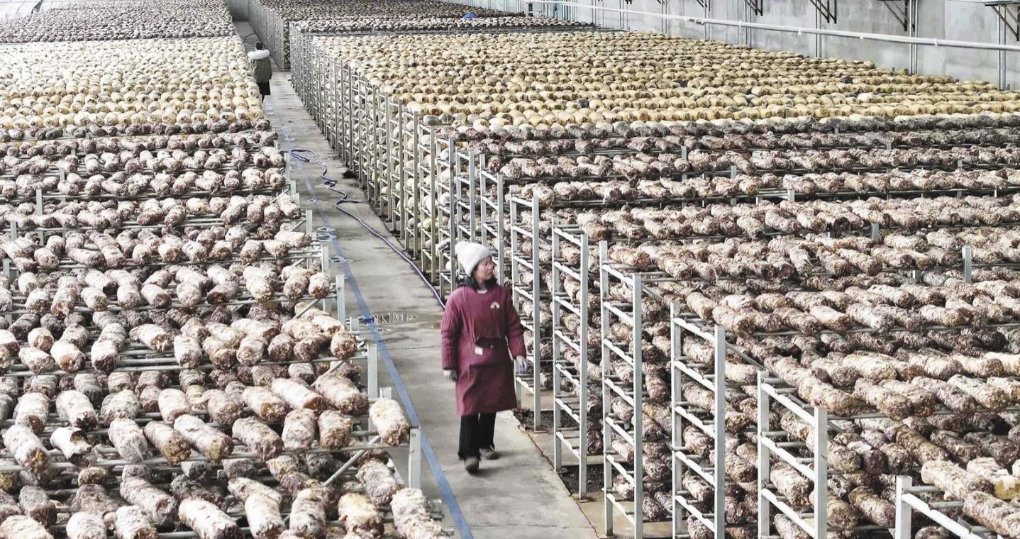 菇農(nóng)在菌菇培育基地查看菌棒生長情況