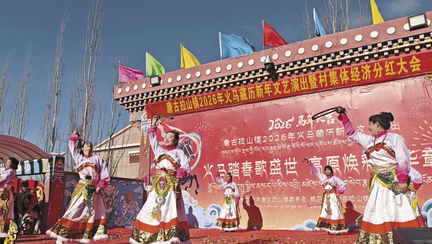 2月5日,海西蒙古族藏族自治州格爾木市唐古拉鎮(zhèn)洋溢著濃厚的節(jié)日氛圍,2026年火馬藏歷新年文藝演出暨村集體經濟分紅大會在這里舉行。村民身著絢麗民族服飾,以一場精彩紛呈的文藝盛宴共迎佳節(jié)。隨后舉行的村集體經濟分紅大會,將活動推向高潮。2025年,唐古拉鎮(zhèn)全鎮(zhèn)7個行政村集體經濟收入338.25萬元,同比增長21.53%。集體經濟持續(xù)壯大,讓發(fā)展成果惠及每位村民,切實提升了人民群眾的獲得感、幸福感、安全感。